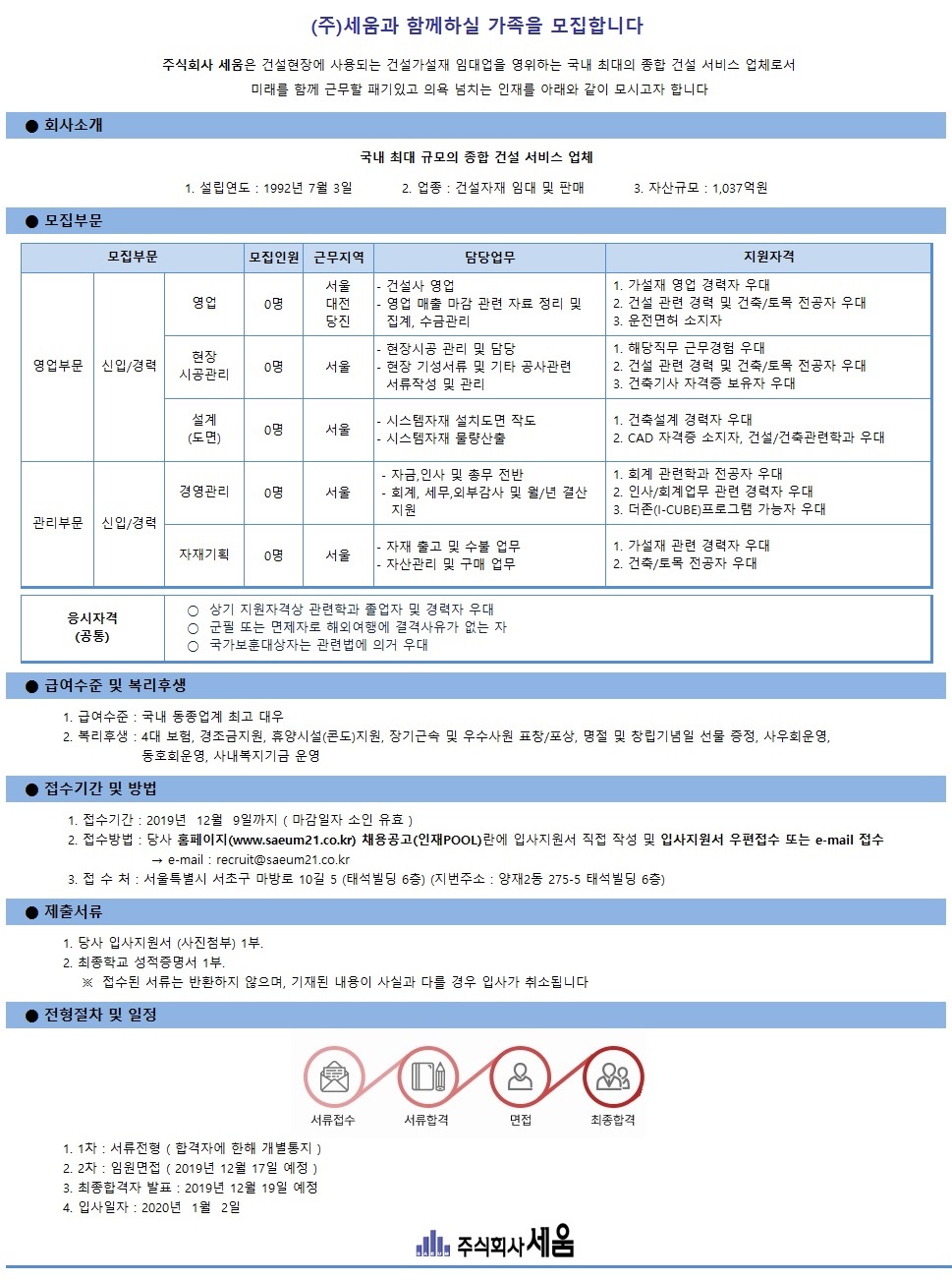 채용공고 마감 신입,경력 2019년 상반기 (주)세움 신입 및 경력 채용 공고 02.11-02.18 게시판 내용 【채용공고】 2020년 신입 및 경력사원 채용 공고 모집분야 영업/현장시공관리/설계/경영관리/자재기획 모집기간 2019-12-02 ~ 2019-12-08