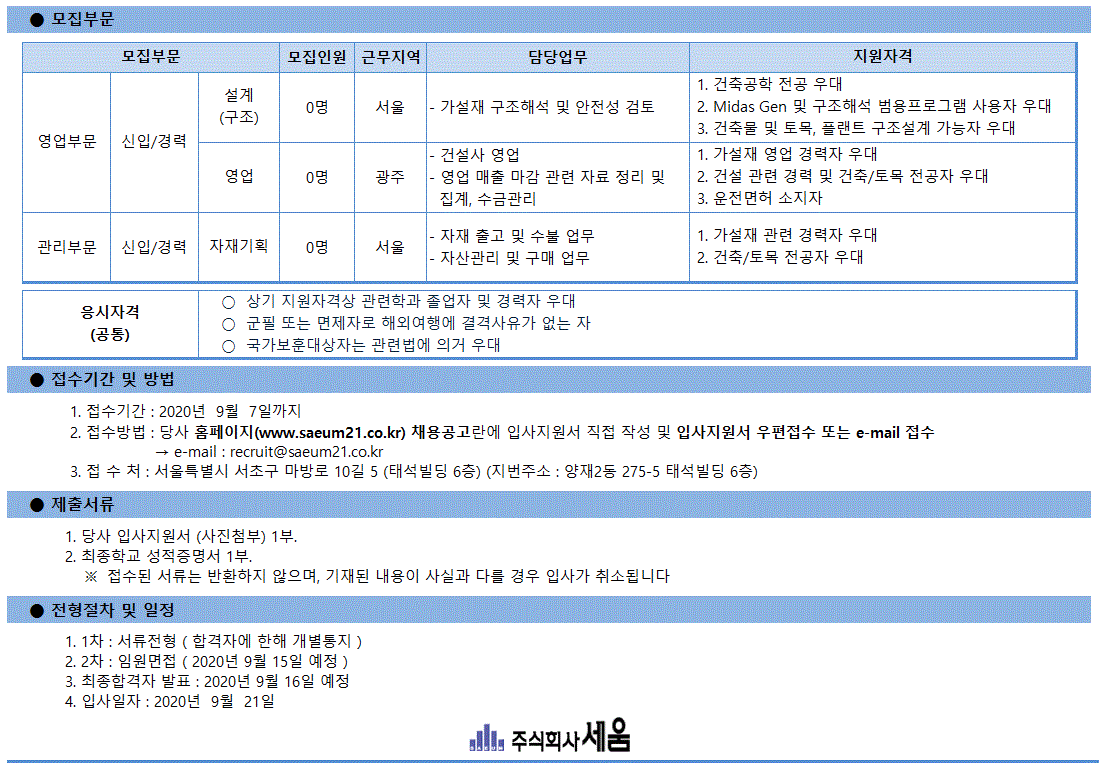 채용공고 마감 신입,경력 2019년 상반기 (주)세움 신입 및 경력 채용 공고 02.11-02.18 게시판 내용 ● 2020년 하반기 부문별 채용공고 모집분야 ● 2020년 하반기 부문별 채용공고 모집기간 2020-08-31 ~ 2020-09-07
