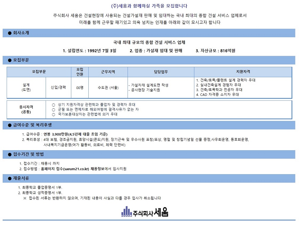 채용공고 마감 신입,경력 2019년 상반기 (주)세움 신입 및 경력 채용 공고 02.11-02.18 게시판 내용 ● 가설재 설계(도면) 신입ㆍ경력사원 채용공고 모집분야 설계(도면) 모집기간 2021-03-31 ~ 2021-04-30