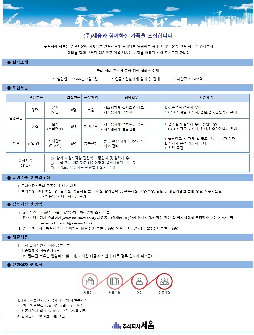 채용공고 마감 신입,경력 2019년 상반기 (주)세움 신입 및 경력 채용 공고 02.11-02.18 게시판 내용 2019년 하반기 신입/경력사원 채용공고 모집분야 2019년 하반기 신입/경력사원 채용공고 모집기간 2019-07-03 ~ 2019-07-15